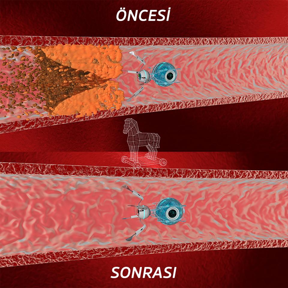 Stanford ve Michigan üniversitelerinden araştırmacılar nanotedavide devrim yaratacak bir buluşa imza attılar. Geliştirdikleri nanotüplere yükledikleri moleküllerle makrofaj dediğimiz atherosklerozun temel kaynağı olan hücreleri hedef aldılar. Aslında kalp damarlarındaki plakların içerisinde yoğun miktarda makrofaj bulunuyor. Bunlar çöpçü hücreler olarak da adlandırılabilirler. Nanotüpler sadece plakların içerisine girip özellikle makrofajları hedef alıyorlar. Makrofajların yeniden programlayıp onları aktive ediyorlar. Böylece makrofajlar plağın yapısındaki ölü hücreleri ve kalıntıları sindirerek plağı küçültüyor ve yapısını sağlamlaştırıyorlar. Yani nanopartiküller Truva atı gibi davranıyorlar. Plağın içerisine girip tüm işleyişi değiştiriyorlar.